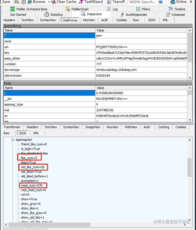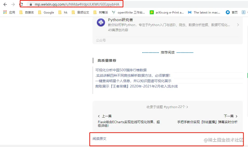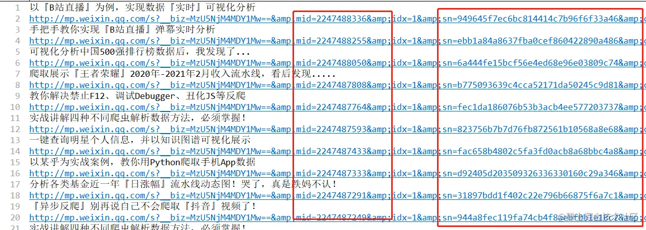 同一个公众号,如果需要获取其他文章的这些数据,只需要改变mid和sn就可以了,不同文章的链接如下图所示