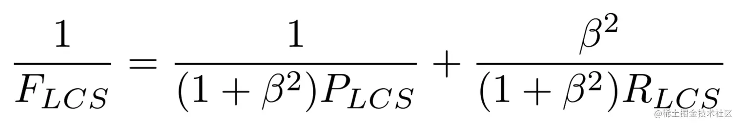 公式中的 R_LCS 表示召回率,而 P_LCS 表示精确率,F_LCS 就是 ROUGE-L。一般 beta 会设置为很大的数,因此 F_LCS 几乎只考虑了 R_LCS (即召回率)。注意这里 beta 大,则 F 会更加关注 R,而不是 P,可以看下面的公式。如果 beta 很大,则 P_LCS 那一项可以忽略不计。