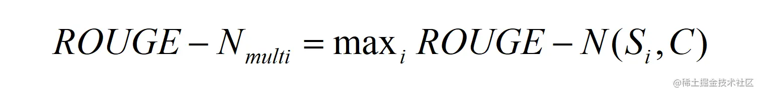 如果给定多个 参考译文 Si,Chin-Yew Lin 也给出了一种计算方法,假设有 M 个译文 S1, ..., SM。ROUGE-N 会分别计算机器译文和这些参考译文的 ROUGE-N 分数,并取其最大值,公式如下。这个方法也可以用于 ROUGE-L,ROUGE-W 和 ROUGE-S。