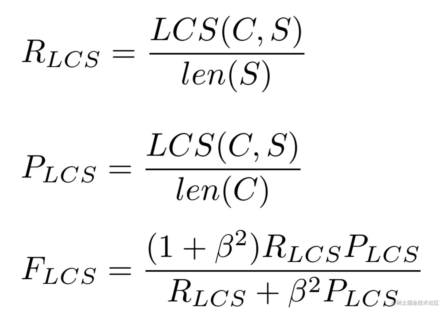 ROUGE-L 中的 L 指最长公共子序列 (longest common subsequence, LCS),ROUGE-L 计算的时候使用了机器译文 C 和参考译文 S 的最长公共子序列,计算公式如下: