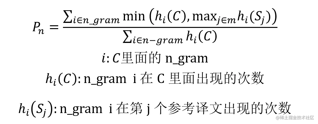一般用 C 表示机器翻译的译文,另外还需要提供 m 个参考的翻译 S1, S2, ..., Sm。评价指标就可以衡量机器翻译的 C 和参考翻译 S1, S2, ..., Sm 的匹配程度。