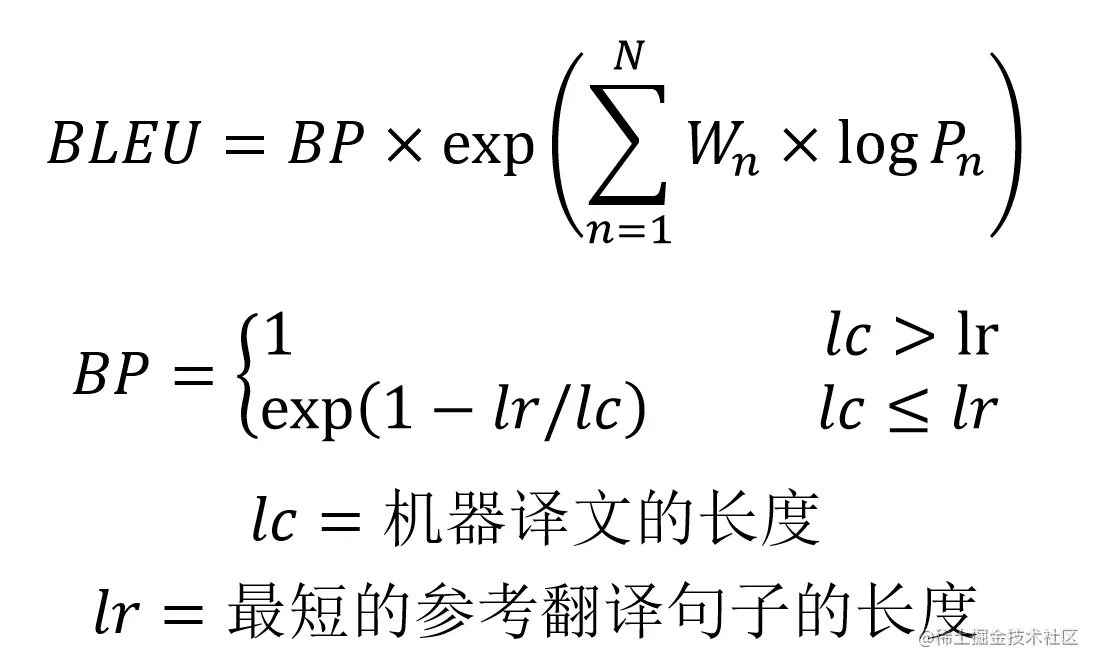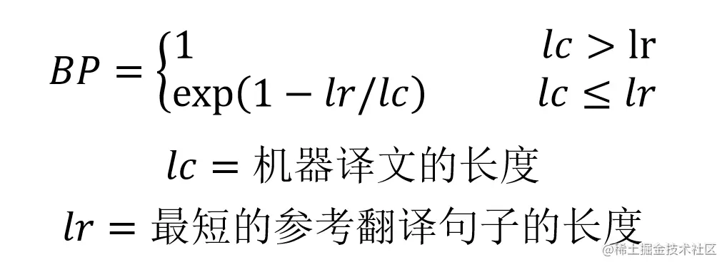 - BP 是惩罚因子,如果译文的长度小于最短的参考译文,则 BP 小于 1。