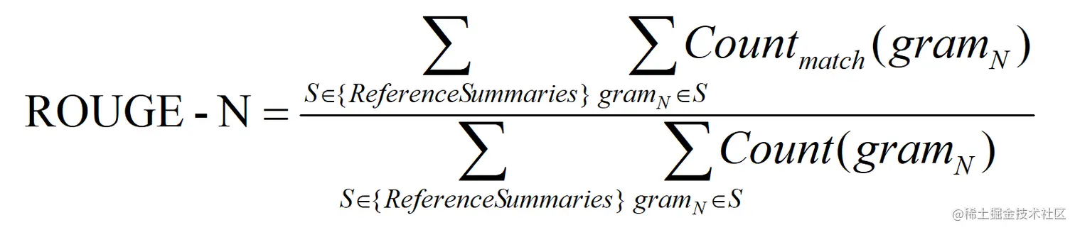 ROUGE-N 主要统计 N-gram 上的召回率,对于 N-gram,可以计算得到 ROUGE-N 分数,计算公式如下: