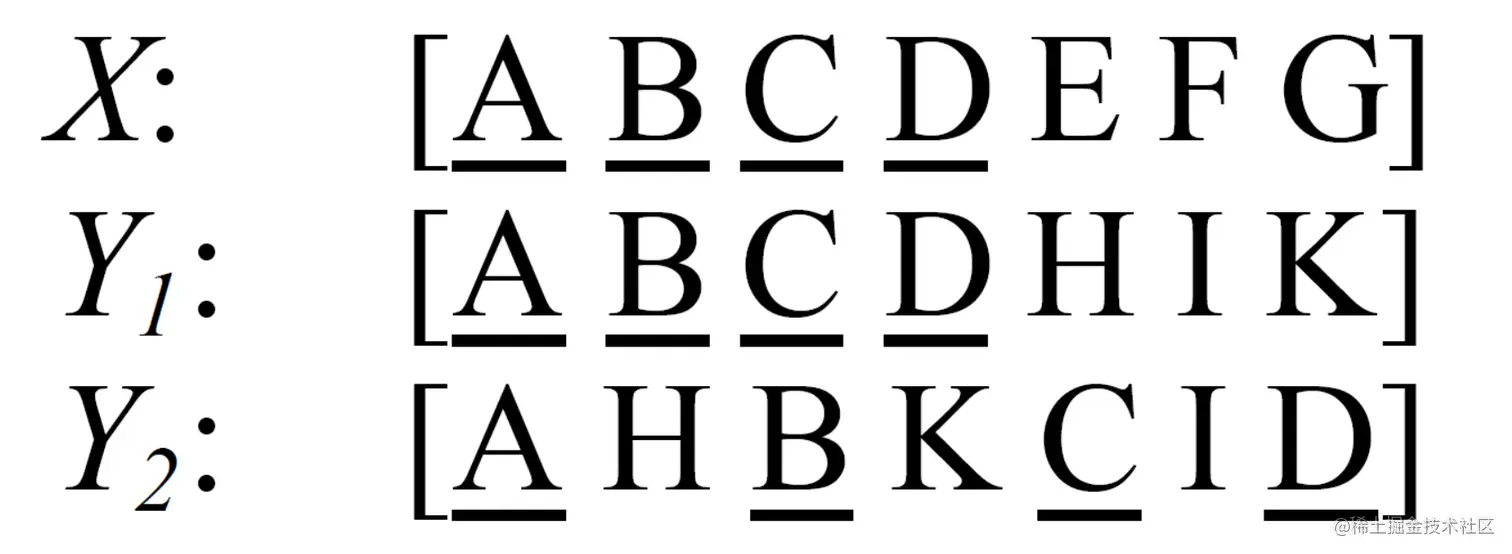 ROUGE-W 是 ROUGE-L 的改进版,考虑下面的例子,X 表示参考译文,而 Y1,Y2 表示两种机器译文。