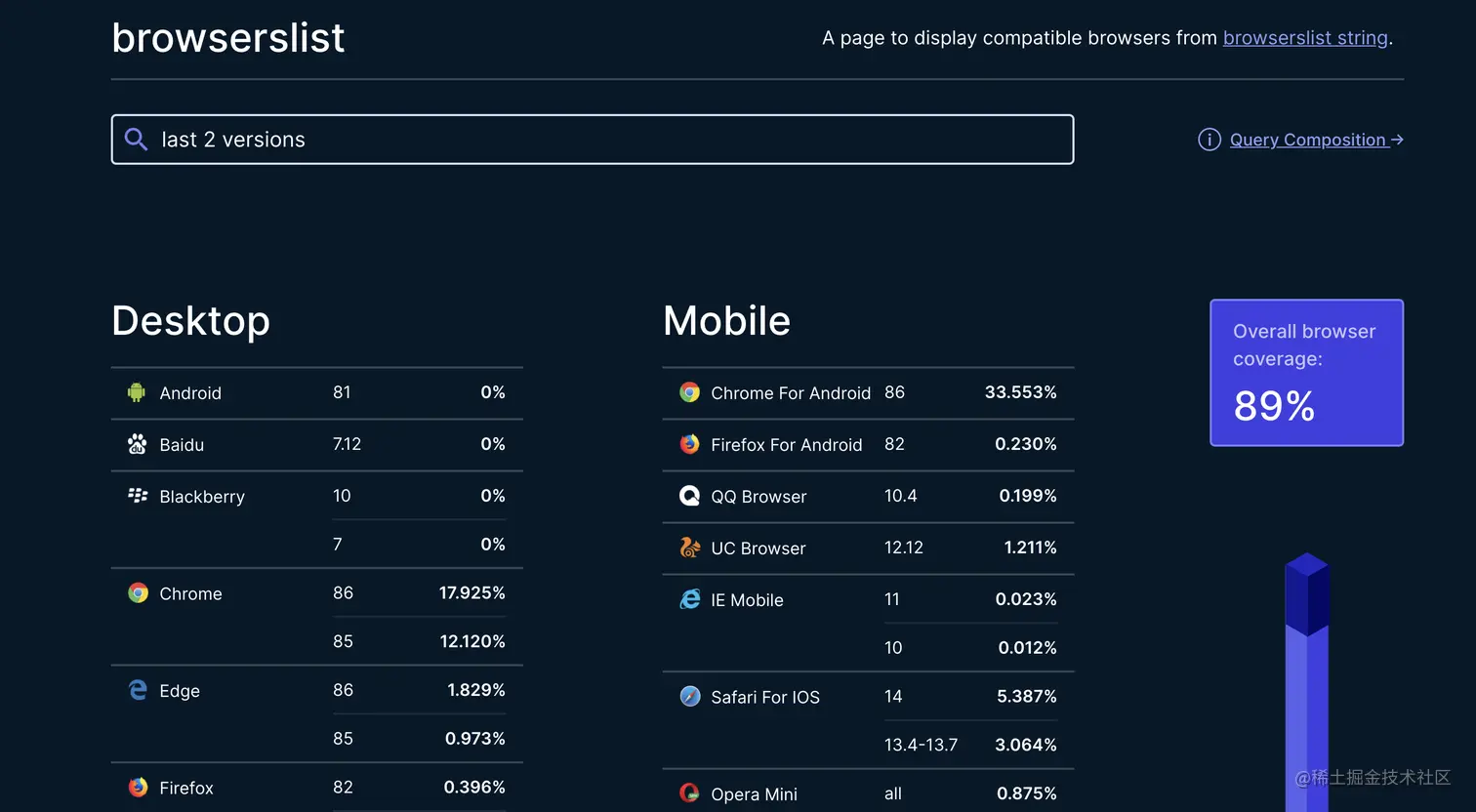 我们可以通过 browserslist.dev 来查看语句匹配情况。截图如下:
