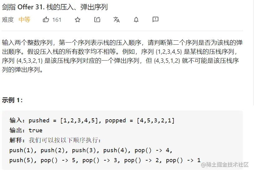 - 核心思路在于想到模拟栈的压入和弹出去对比popped的指针指向的元素,最后通过判断栈是否为空,来判断是否属于栈的压入和弹出。