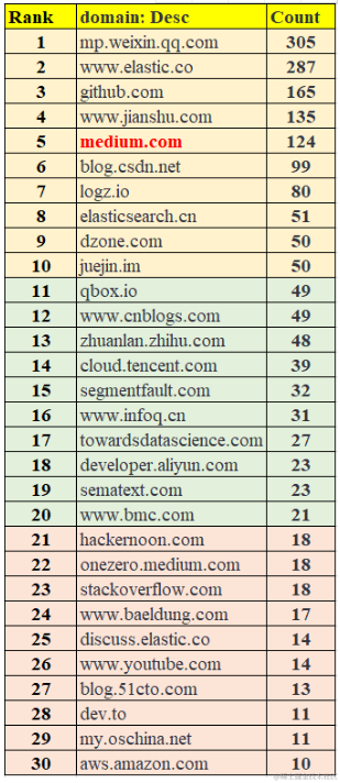 机器汇集 3000 + 精彩人工推荐的 Elastic 博文,统计汇总后 TOP 文章来源统计如下: