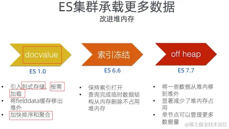 - 当其远大于可用内存,操作系统会自动把 Doc Values 加载到系统的页缓存中,从而避免了 jvm 堆内存溢出异常。