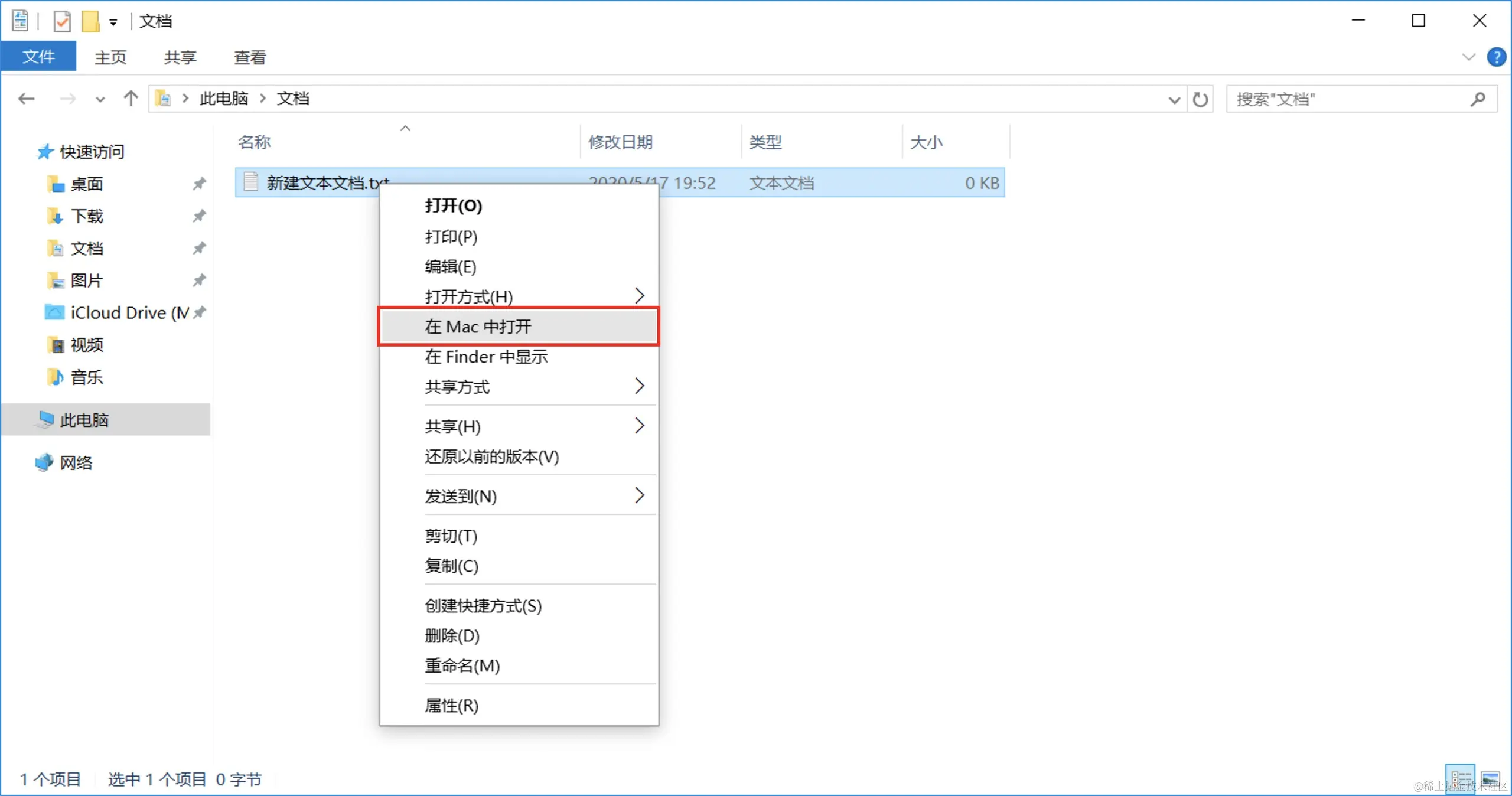 在Windows系统中新建一个文本文件,选择在Mac中打开: