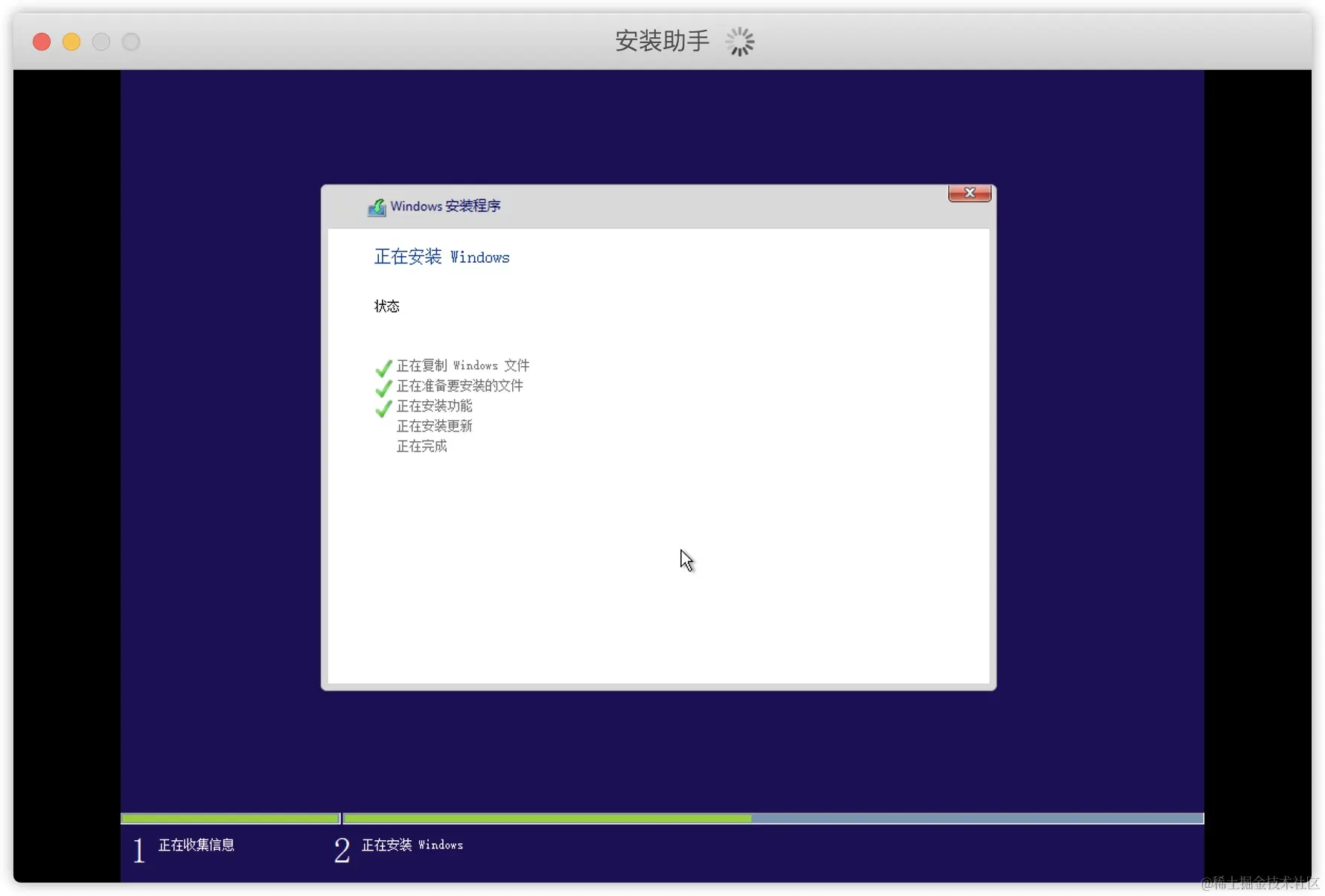 接下来就是常规的Win10系统安装步骤了,基本一直下一步就可以了,和在真实物理机安装系统时一样。在系统安装完成之前,界面会比较小,安装完成之后就会恢复正常。