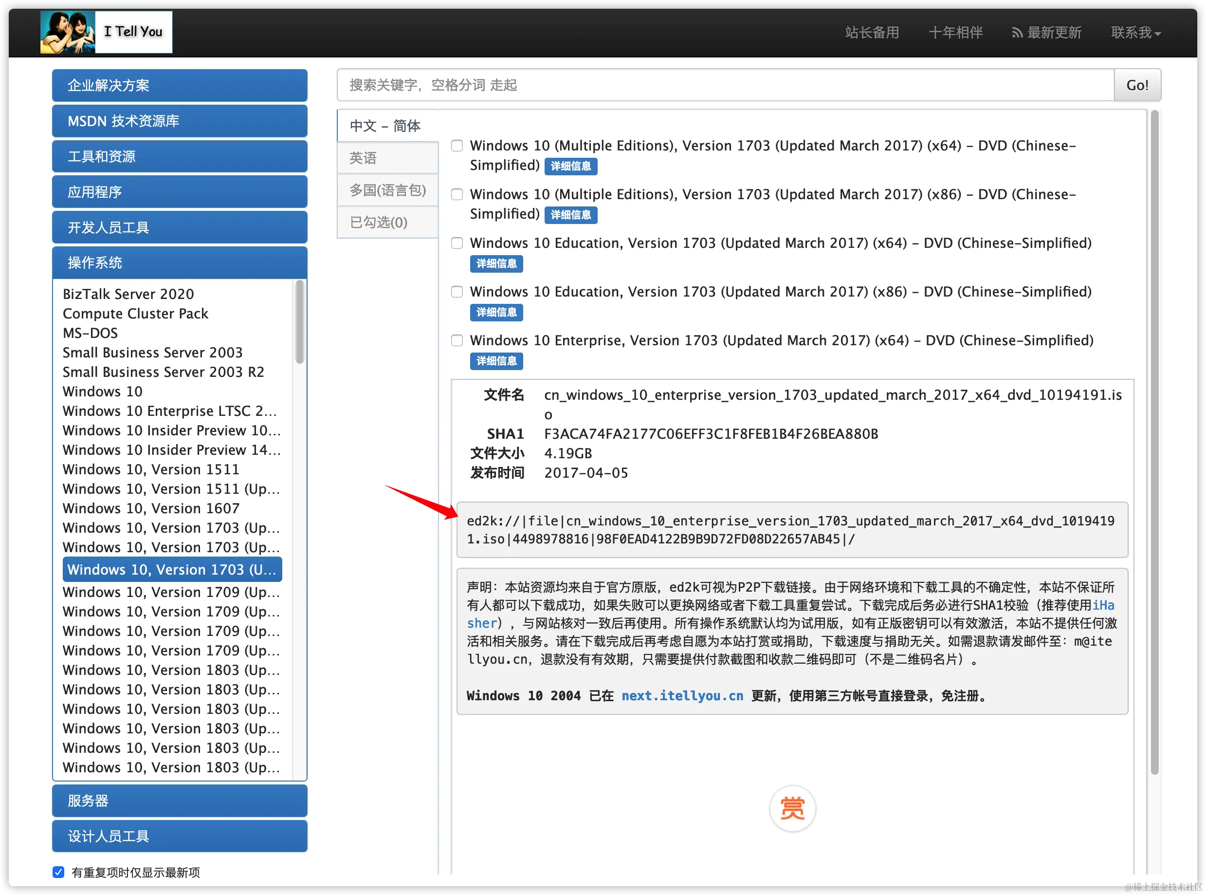 大家下载什么版本的Win10其实并不要紧,因为安装之后可以再进行更新,只要不太旧就好,但是企业版、教育版、个人版这些大的版本要根据自己的喜好选对,以下给出上方截图的ed2k,复制到迅雷下载。