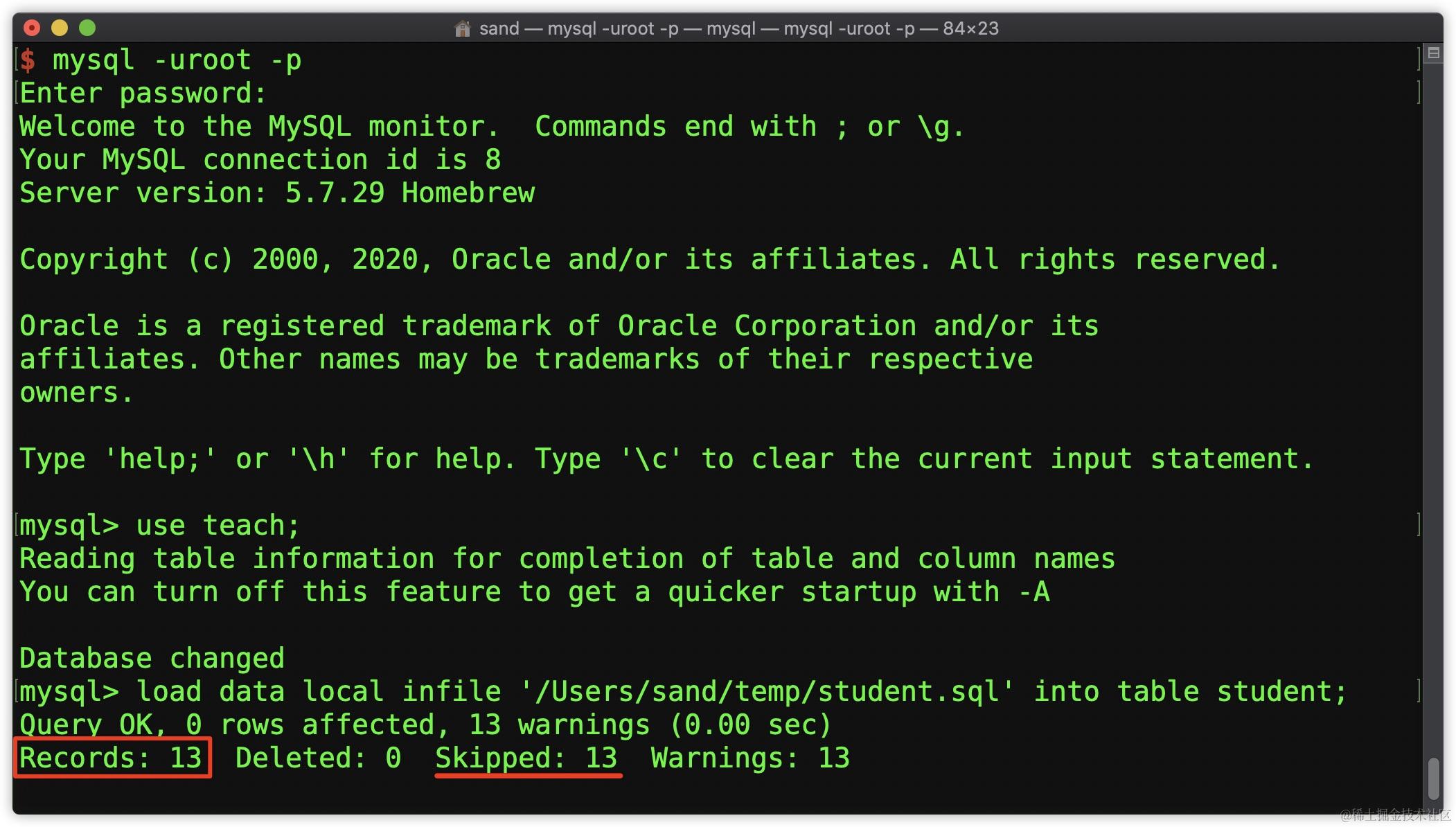 加载sql文件后会显示每条SQL语句的执行结果,其中Query OK代表成功,rows affected代表当前语句对数据库的影响行数(0 rows affected对应建表语句和各种指令,只要显示Query OK就证明执行成功)。