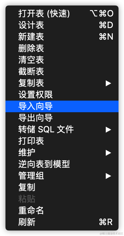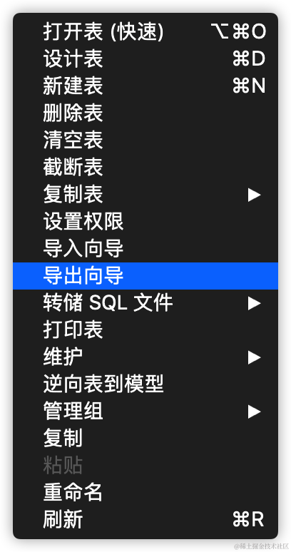 使用界面化工具来进行数据导出十分简单,以Navicat为例。选择某一个数据表,右键点击:导出向导。