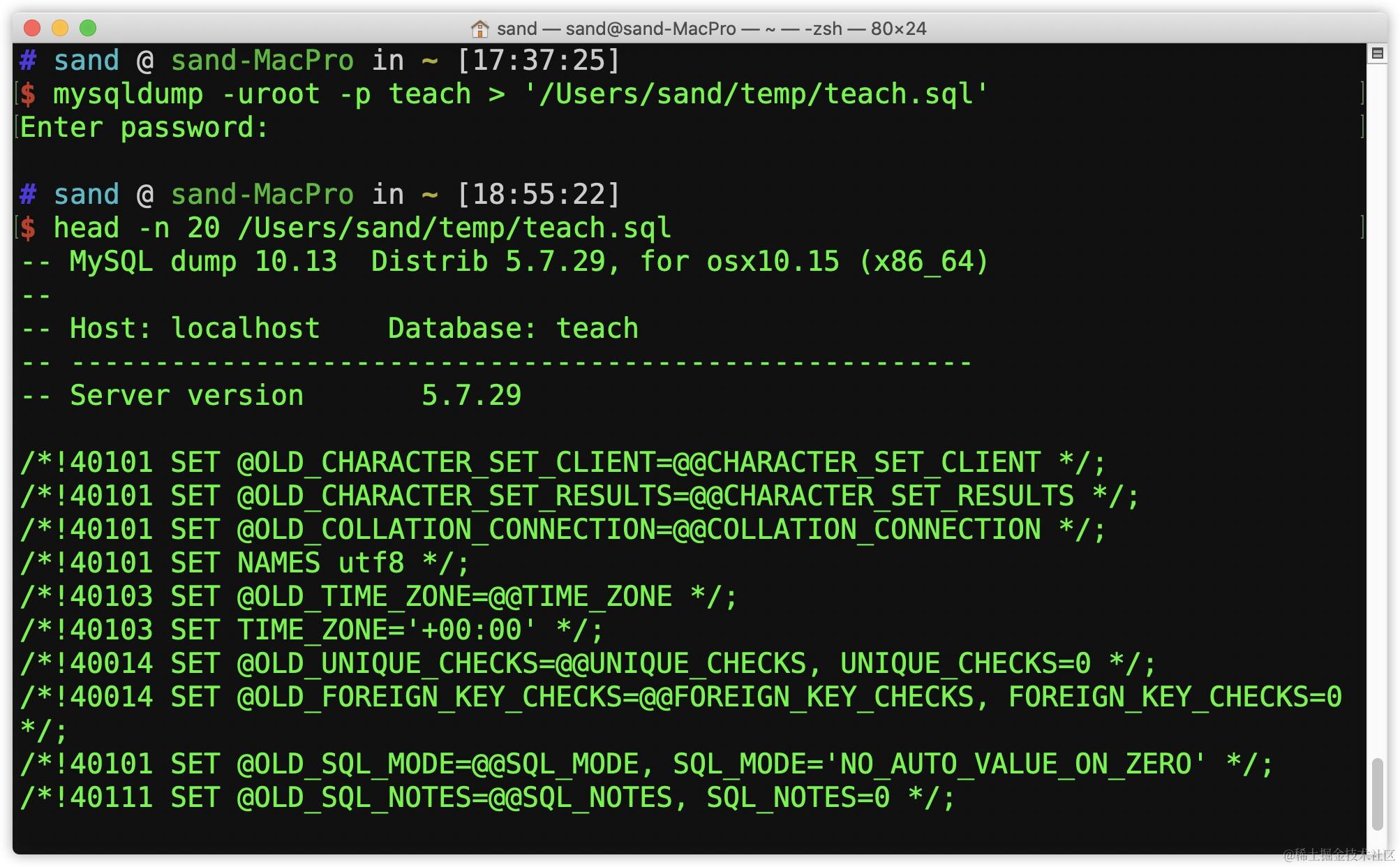 mysqldump -u 用户名 -p 数据库名 > '文件路径'