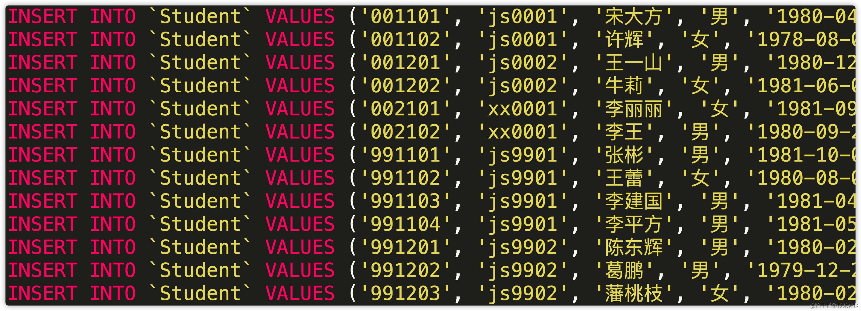 通过这种方式导出的sql文件只包含数据,并不包含表结构,如下: