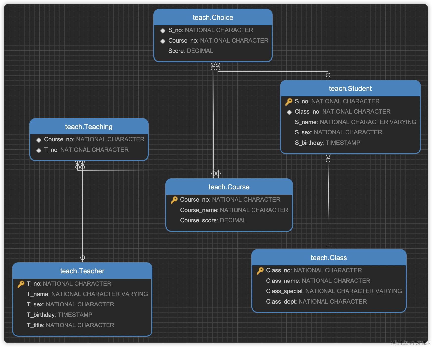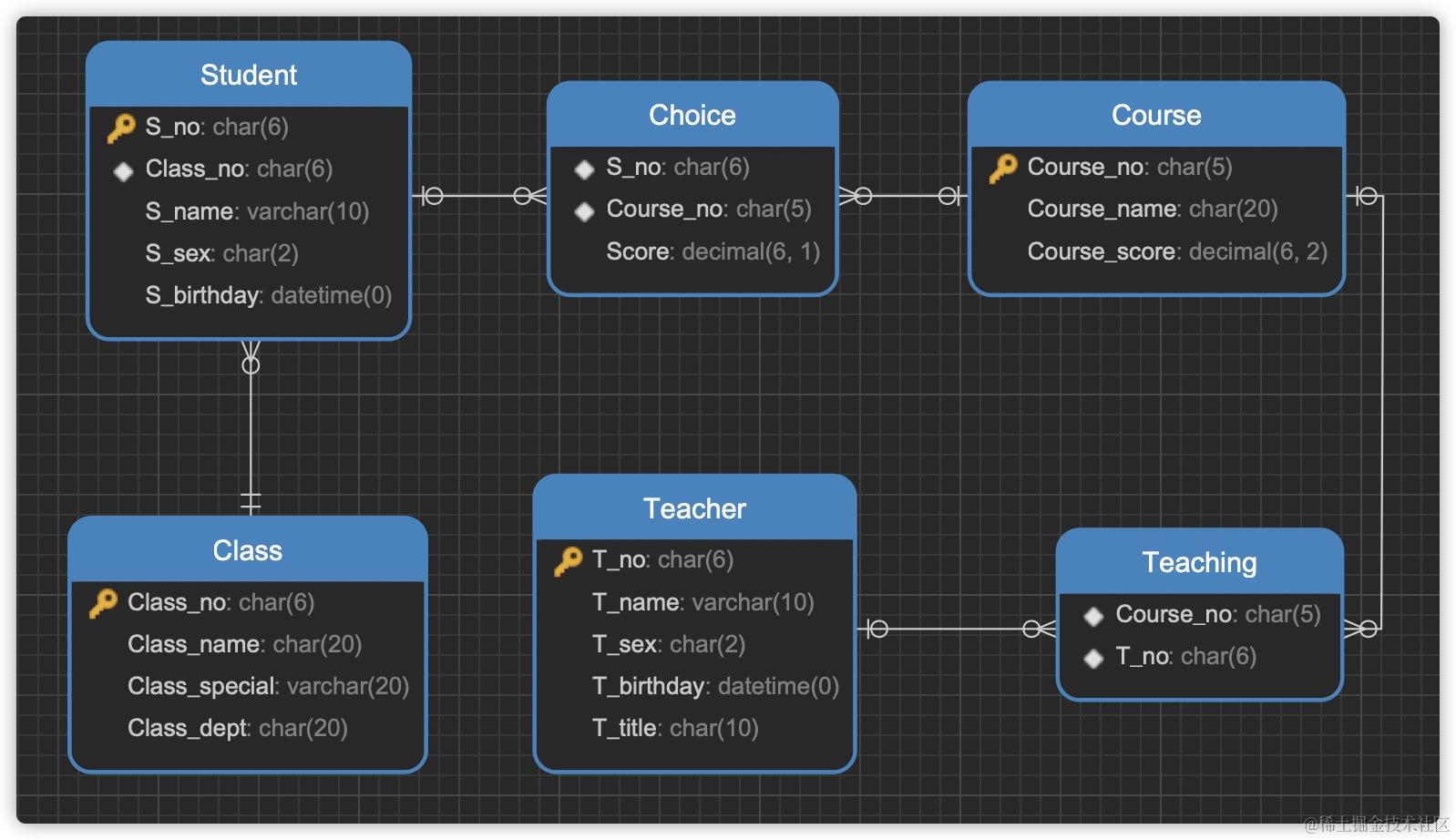 - 多对多:根据一个实例,能够找到多个对应实例,反过来亦然(如:一个学生 -> 选多门课,一门课 -> 被多人选)