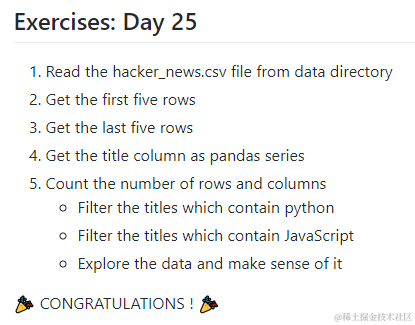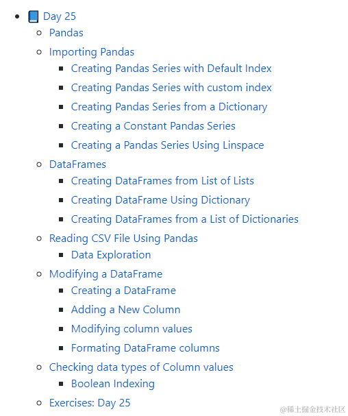 例如第25天的Pandas数据分析内容,作者先给了个目录:\
