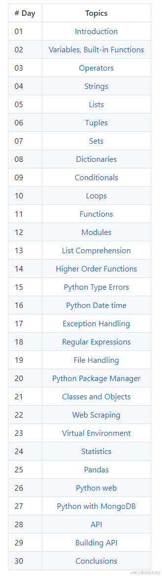 更多加了Python的不同方向内容学习,例如网络爬虫、项目虚拟环境搭建、统计学、数据分析、web页面搭建、数据库交互、API、打造API。(22~29天的内容)