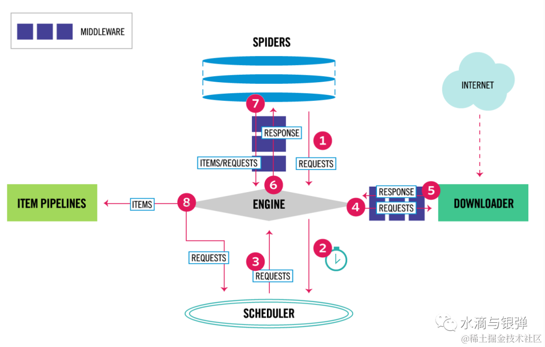按照上面架构图标识出的序号,我们可以看到,Scrapy 运行时的数据流转大概是这样的: