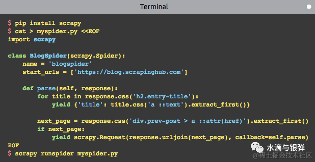 使用 Scrapy 开发一个爬虫非常简单,这里使用 Scrapy 官网上的例子来说明如何编写一个简单爬虫: