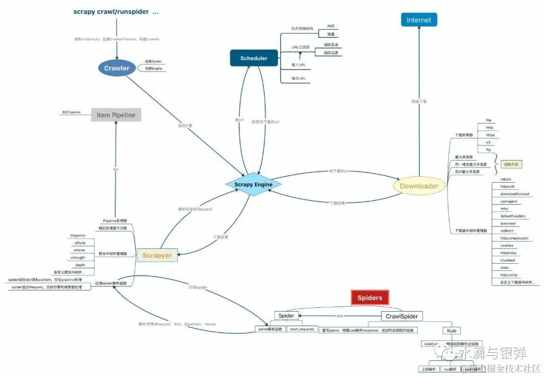 可见,Scrapy 的架构图还是比较清晰的,各个模块之间互相协作,完成抓取任务。