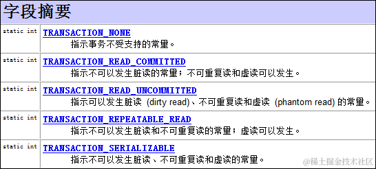 如果是使用JDBC对数据库的事务设置隔离级别的话,也应该是在调用Connection对象的setAutoCommit(false)方法之前。调用Connection对象的setTransactionIsolation(level)即可设置当前链接的隔离级别,至于参数level,可以使用Connection对象的字段: