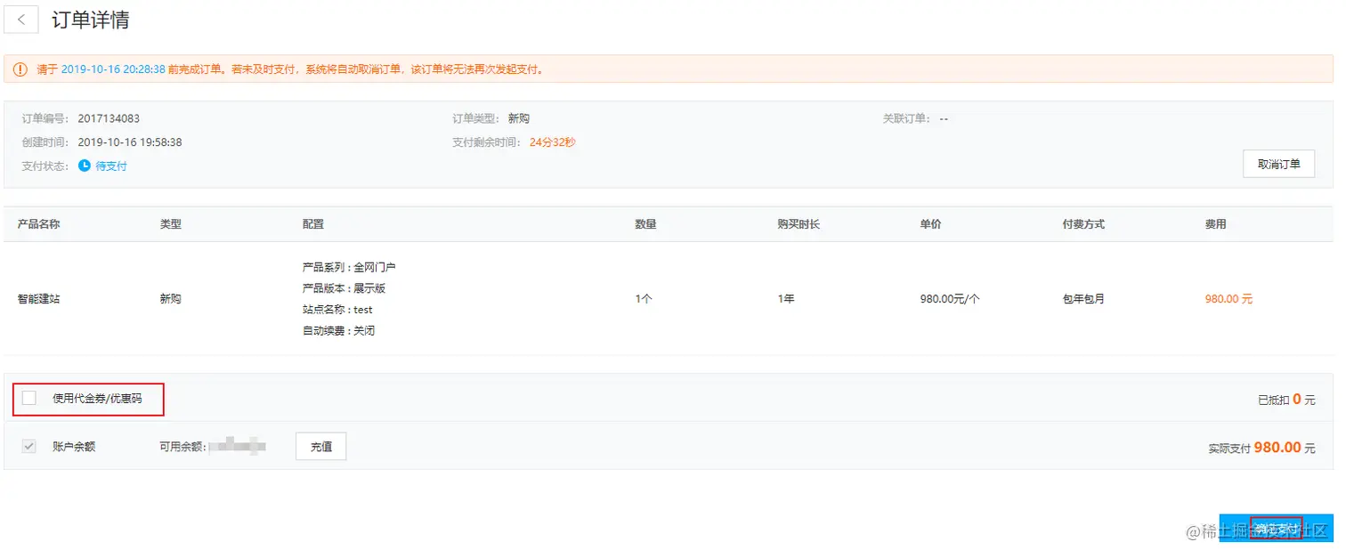 3.在下图所示的新页面中确认您的订单信息,如有优惠券请在左下方勾选使用代金券/优惠码,之后点击【确定支付】按钮使用余额支付,若余额不足,请充值。