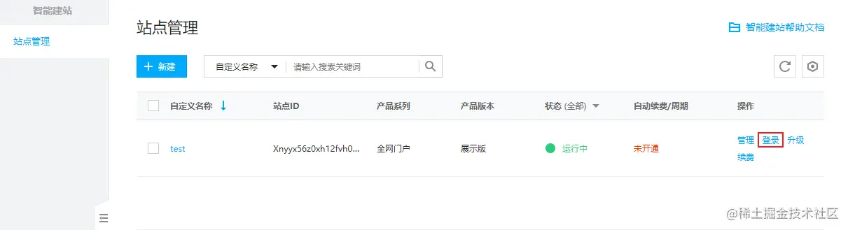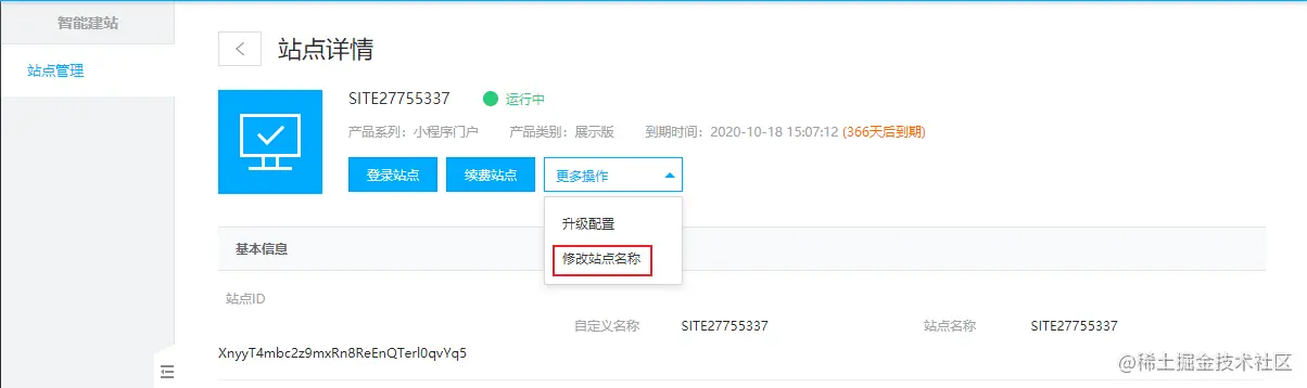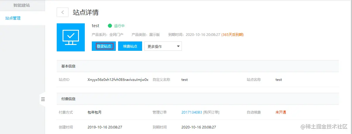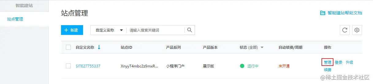 - 控制台 - 智能建站,在站点列表界面,点击【管理】进入站点详情页面。