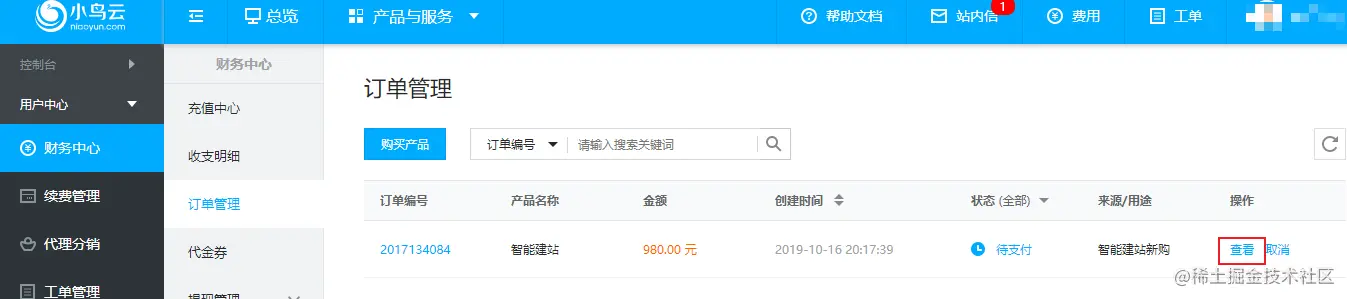 5.如果您不慎中断了支付过程,可以在“财务中心-订单管理”中找到这个未支付完成的订单,点击【查看】进入订单详情页面,完成支付