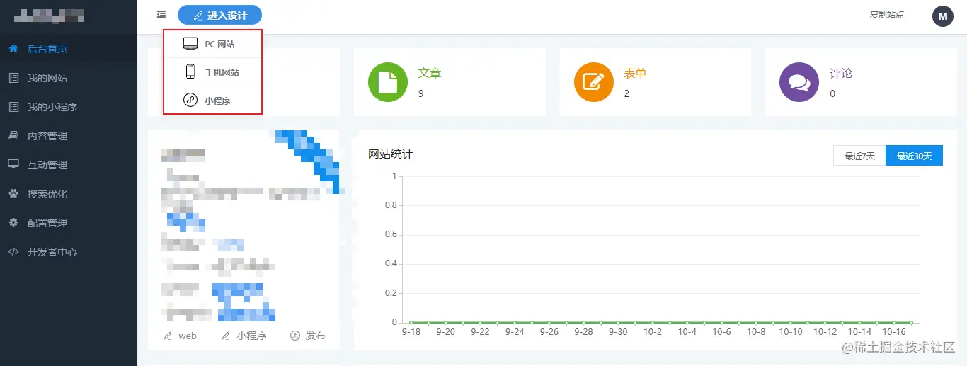 2.进入该站点的管理后台界面后,从顶部的【进入设计】进入设计器(可选择:PC网站设计器、手机网站设计器、小程序设计器),如下图: