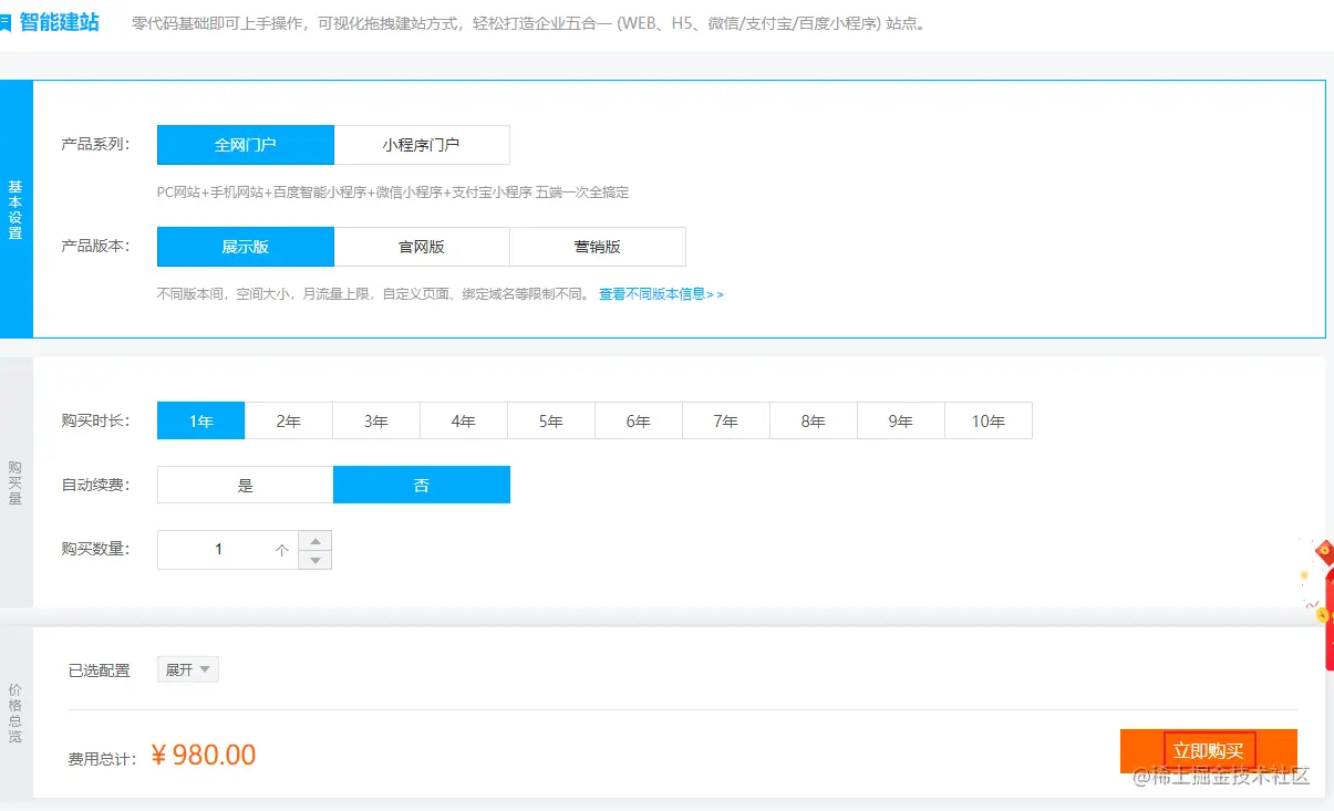 2.选择您所需要购买的系列、版本以及购买时长和购买数量,然后点击页面底部的【立即购买】按钮。