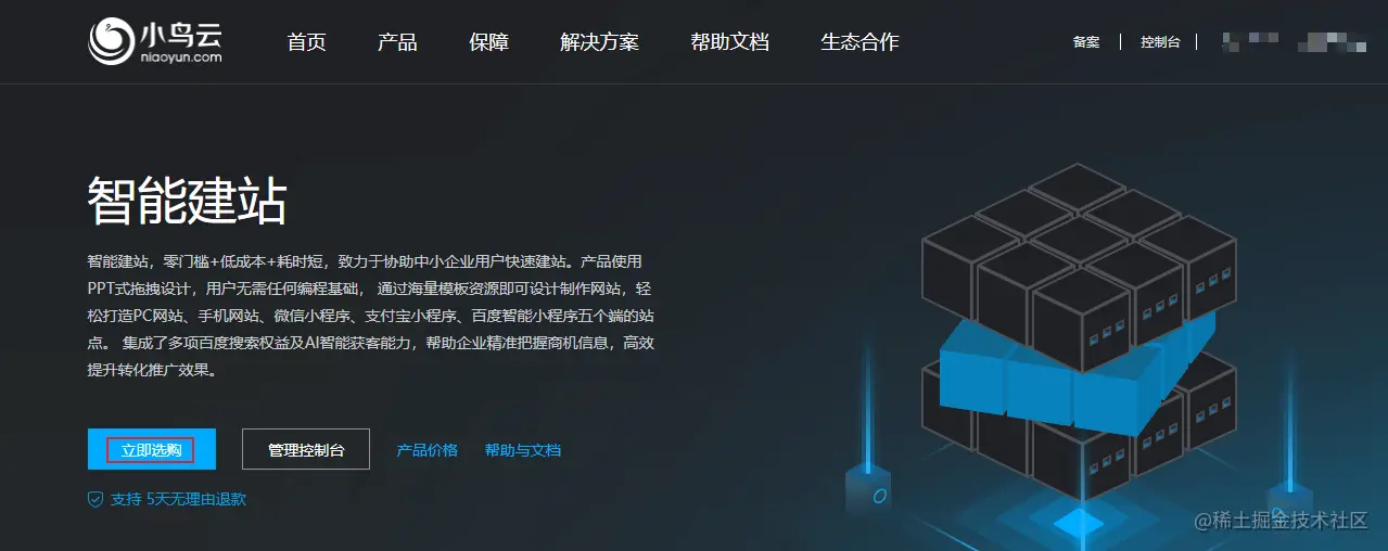 1.登录小鸟云(官网),选择产品-智能建站,进入智能建站门户产品页。