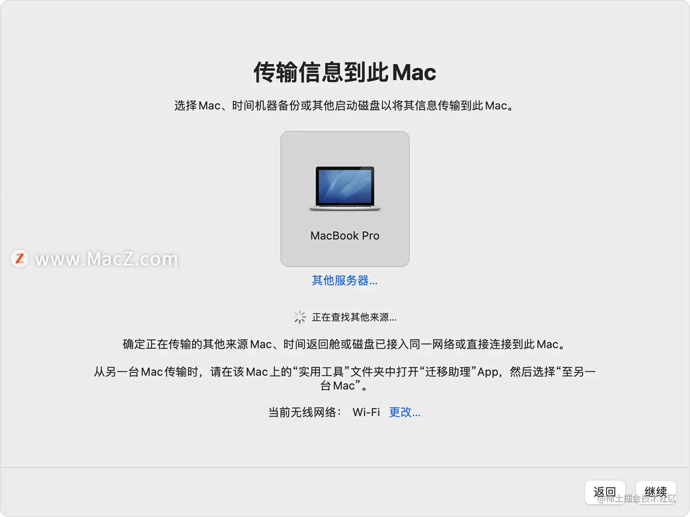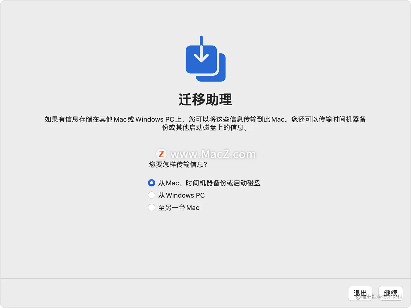 在**新Mac上,**当系统询问您要怎样传输信息时,请选择从 Mac、“时间机器”备份或启动磁盘进行传输的方式。然后,点按“继续”。
