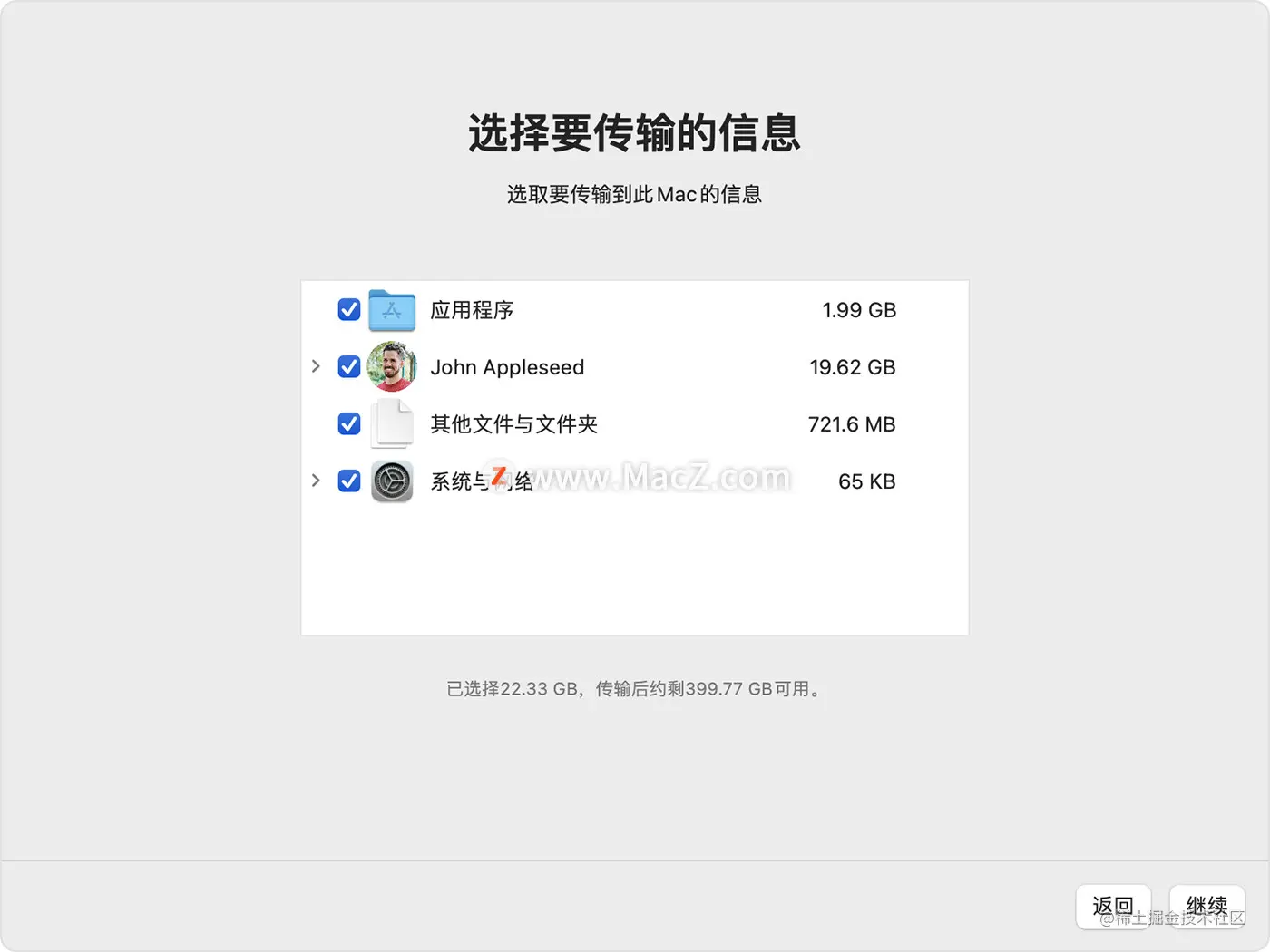 在这个示例中,John Appleseed 是一个 macOS 用户帐户。如果这个帐户与新 Mac 上已有的帐户同名,则系统会提示您重命名这个旧帐户或替换新 Mac 上的帐户。如果进行重命名,则这个旧帐户会作为单独的用户出现在新 Mac 上,并且拥有单独的个人文件夹和登录名。如果进行替换,则这个旧帐户会删除并随后替换新 Mac 上的帐户,包括相应个人文件夹中的所有内容。