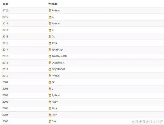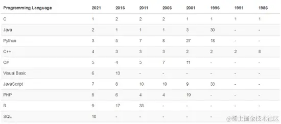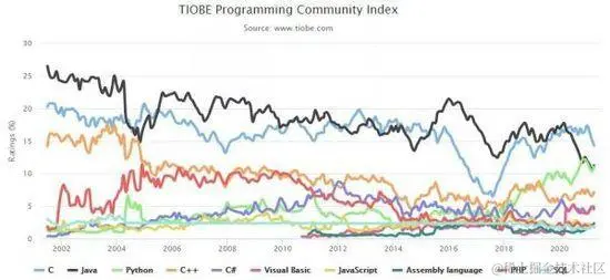 TIOBE 编程语言社区排行榜是编程语言流行趋势的一个指标,每月更新,这份排行榜排名基于全球技术工程师、课程和第三方供应商的数量,其中包括了流行的搜索引擎以及技术社区,如 Google、百度、维基百科、CSDN、必应、Hao 123 等等。具体的计算方式详见:www.tiobe.com/tiobe-index…
