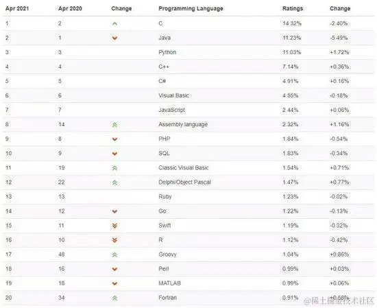 编程语言社区 TIOBE 最新发布了4月编程语言排行榜:C语言还是居第一,Java第二,python第三。其中Python以1.72%的最高涨幅,达到了11.03%的占比。