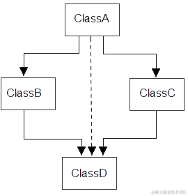在上面的示例中,ClassB和ClassC都继承了ClassA,它们都具有ClassA的单个副本。但是,ClassD继承了ClassB和ClassC,因此ClassD具有两个ClassA副本,一个副本来自ClassB,另一个副本来自ClassC。