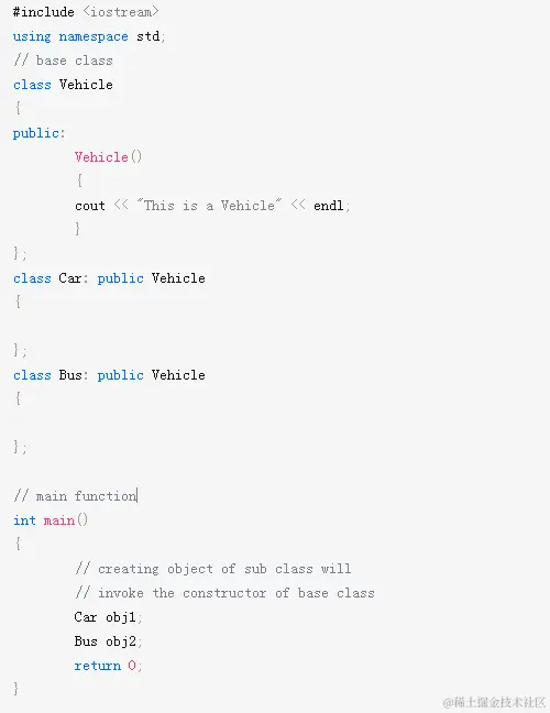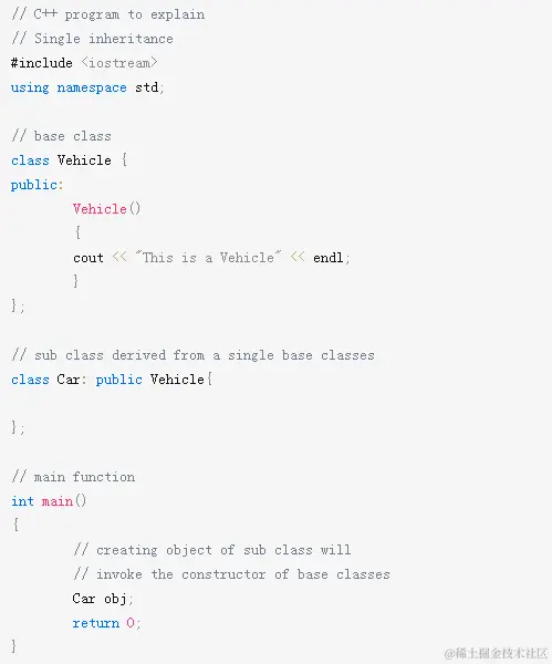 在这里,subclass_name是子类的名称,access_mode是您要继承该子类的模式,例如:public,private等,而base_class_name是您要从其继承子类的基类的名称。