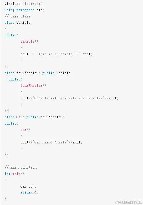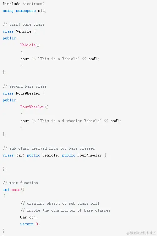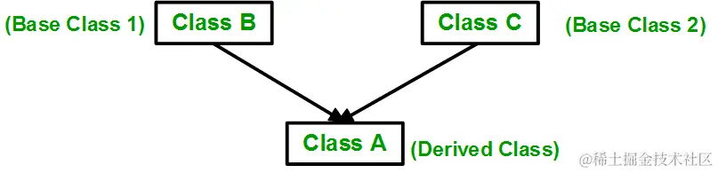 2.多重继承:多重继承是C ++的一项功能,其中一个类可以从多个类中继承。即一个子类是从一个以上的基类继承的。