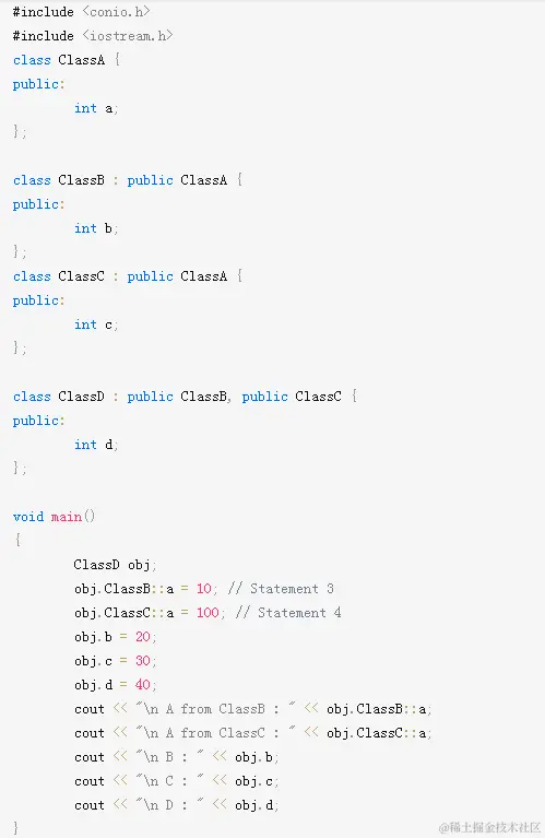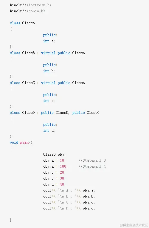 如果我们需要通过ClassD的对象访问ClassA的数据成员a,则必须指定从中访问a的路径,无论它是来自ClassB还是ClassC,bco'z编译器都无法区分ClassA的两个副本在ClassD中。