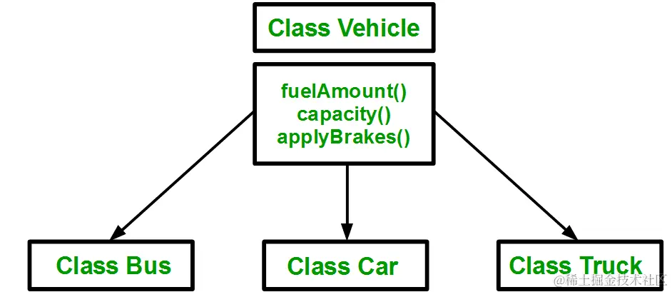 考虑一组车辆。您需要为公交车,汽车和卡车创建类。对于这三个类,方法fuelAmount(),capacity(),applyBrakes()都是相同的。如果我们创建这些类以避免继承,则必须在三个类的每一个中编写所有这些函数,如下图所示: