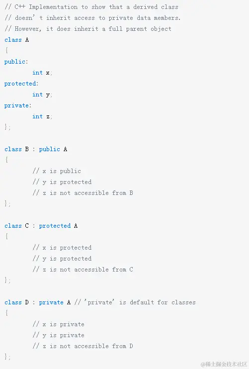 注意:无法直接在派生类中访问基类中的私有成员,而可以直接访问受保护的成员。例如,在下面的示例中,类B,C和D都包含变量x,y和z。这只是访问的问题。