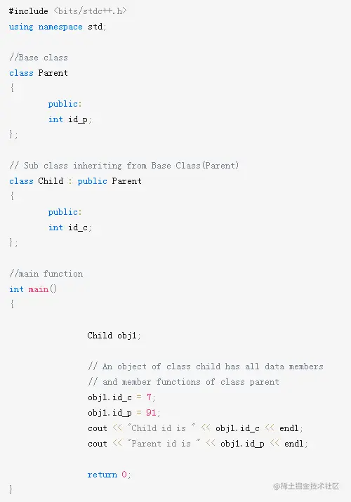 在上面的程序中,“孩子”类是从“父母”类公开继承的,因此,“孩子”类的公共数据成员也将被“孩子”类继承。