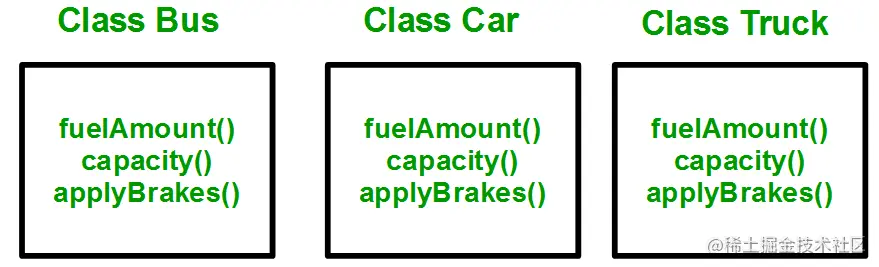 考虑一组车辆。您需要为公交车,汽车和卡车创建类。对于这三个类,方法fuelAmount(),capacity(),applyBrakes()都是相同的。如果我们创建这些类以避免继承,则必须在三个类的每一个中编写所有这些函数,如下图所示: