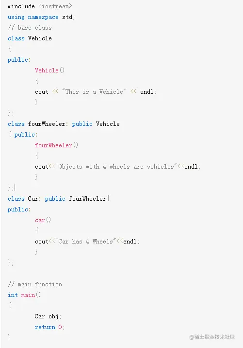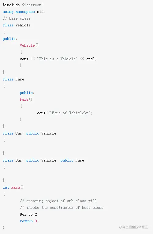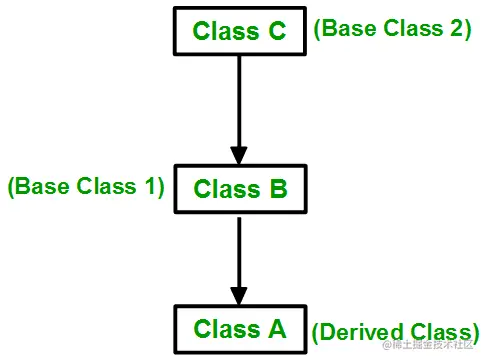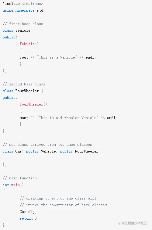 2.多重继承:多重继承是C ++的一项功能,其中一个类可以从多个类中继承。即一个子类是从一个以上的基类继承的。