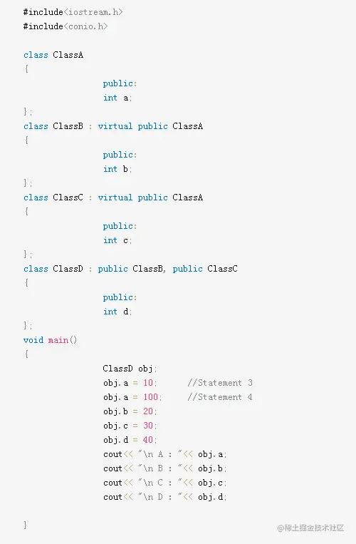 如果我们需要通过ClassD的对象访问ClassA的数据成员a,则必须指定从中访问a的路径,无论它是来自ClassB还是ClassC,bco'z编译器都无法区分ClassA的两个副本在ClassD中。
