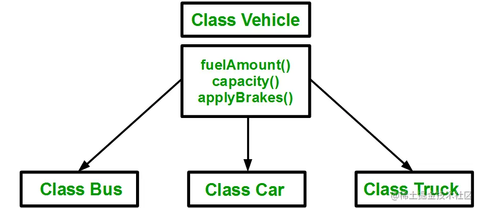 您可以清楚地看到,上述过程导致相同代码重复3次。这增加了错误和数据冗余的机会。为了避免这种情况,将使用继承。如果我们创建一个Vehicle类,并在其中编写这三个函数,并从Vehicle类继承其余类,那么我们可以简单地避免数据重复并提高可重用性。请看下图,其中三个类别是从车辆类别继承的: