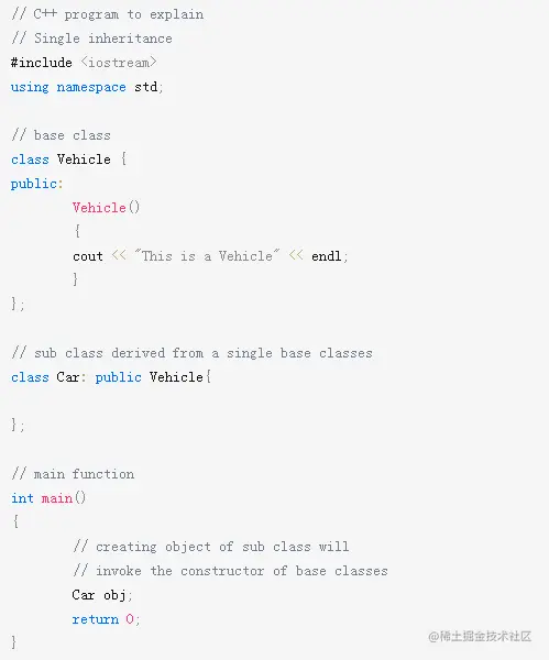 在这里,subclass_name是子类的名称,access_mode是您要继承该子类的模式,例如:public,private等,而base_class_name是您要从其继承子类的基类的名称。