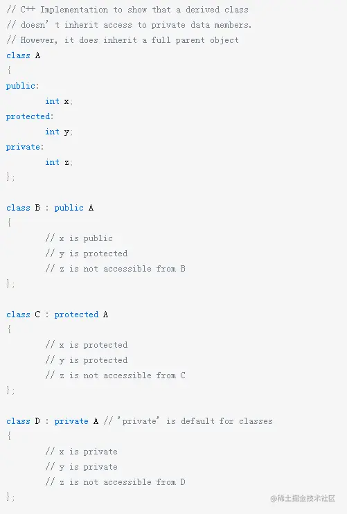 注意:无法直接在派生类中访问基类中的私有成员,而可以直接访问受保护的成员。例如,在下面的示例中,类B,C和D都包含变量x,y和z。这只是访问的问题。