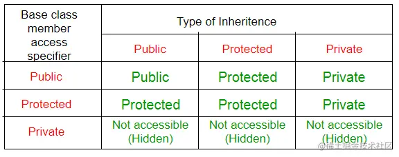 下表总结了上述三种模式,并显示了以公共,保护和私有模式派生时子类中基类成员的访问说明符: